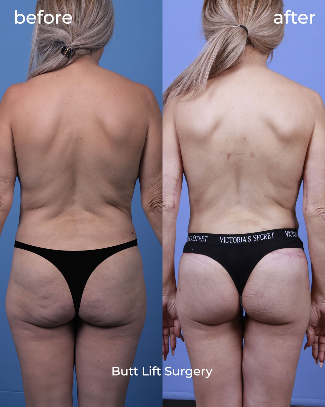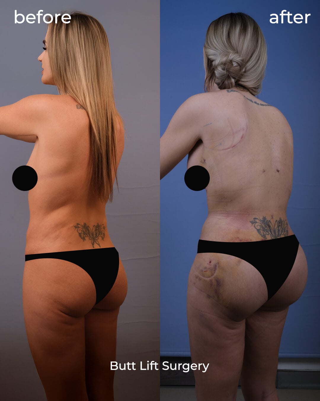 - التقنية: شفط الدهون + حقن الدهون لتحسين الحجم