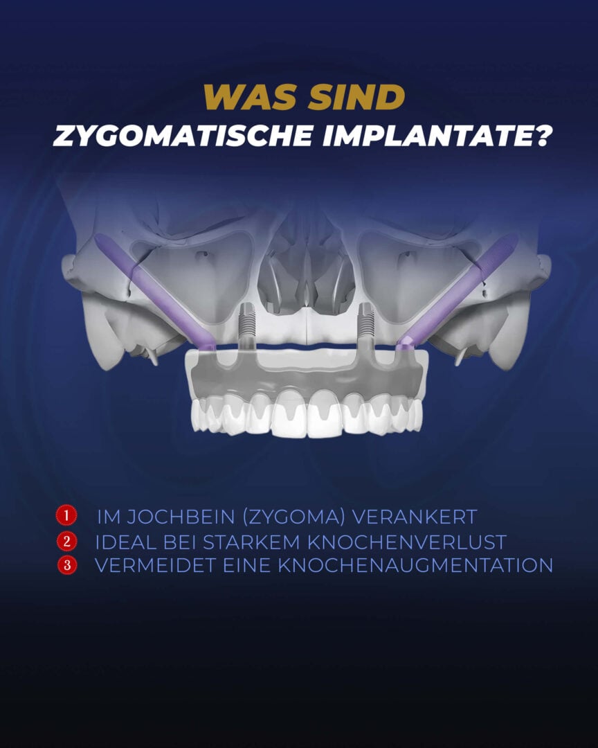 - Traditionelle Implantate sind ideal für Personen mit ausreichender Kieferknochendichte, während zygomatische Implantate für diejenigen geeignet sind, die für reguläre Implantate nicht geeignet sind, da sie in den Jochbeinen verankert werden.